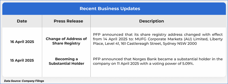 The stock has declined by ~14.94% in the last six months, whereas over the last nine months, the stock has corrected by ~17.26%. The stock has a 52-week low and 52-week high of AUD 4.77 and AUD 6.16, respectively, and is currently trading close to its 52-week low. PFP was last covered in a report dated ‘28 February 2024’.