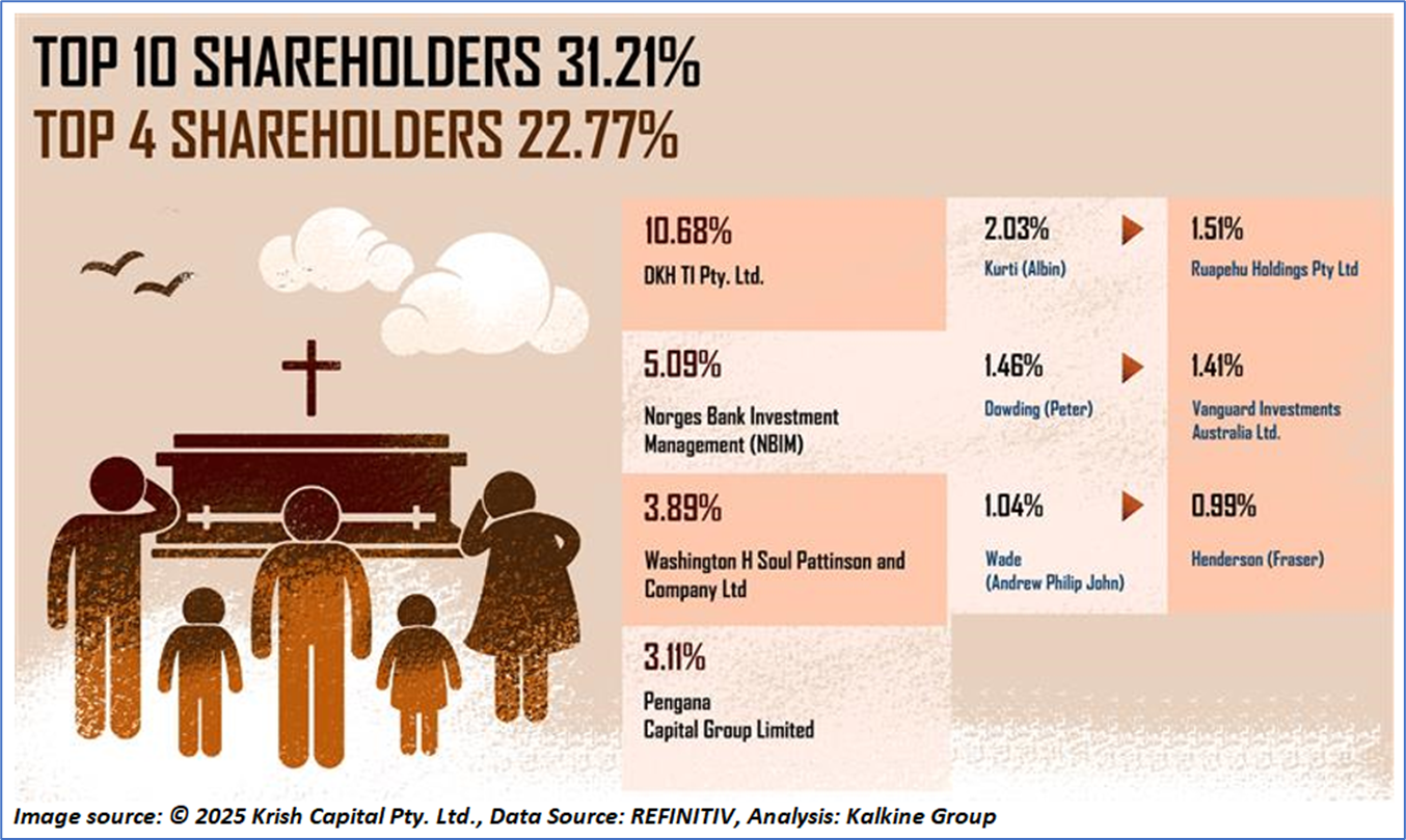 The top 10 shareholders together form ~31.21% of the total shareholding. DKH TI Pty. Ltd. and Norges Bank Investment Management (NBIM) hold maximum stakes in the company at ~10.68% and 5.09%, respectively.