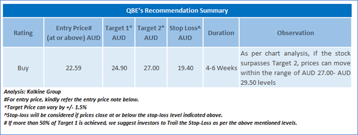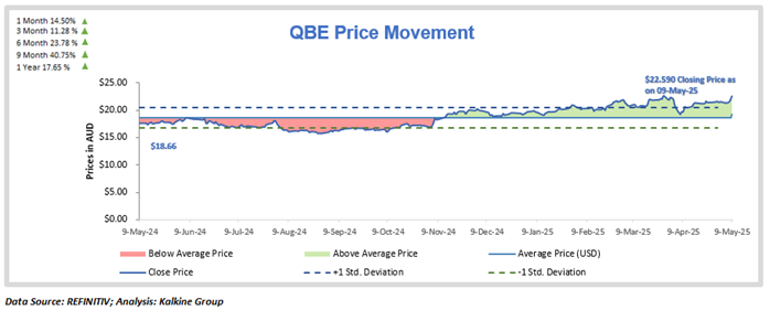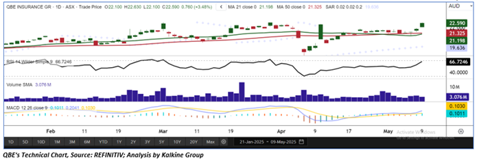 As per the above-mentioned price action and technical indicators analysis, a ‘Buy’ rating has been given on QBE Insurance Group Limited (ASX: QBE) at the close price of AUD 22.59 as on May 9, 2025.
