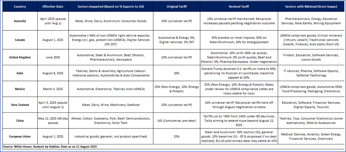 As illustrated in the table below, several key sectors in different countries are directly impacted by the recent tariff announcement from President Trump.