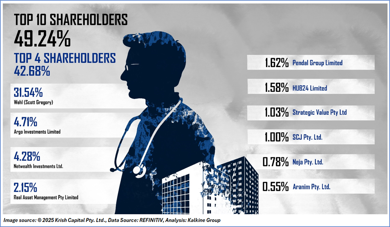 The top 10 shareholders together form ~49.24% of the total shareholding. Wehl (Scott Gregory) and Argo Investments Limited hold maximum stakes of 31.54% and 4.71%, respectively.