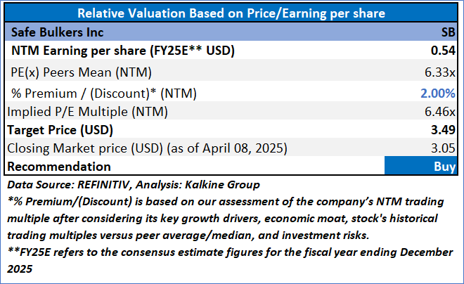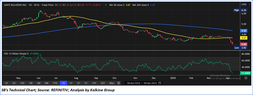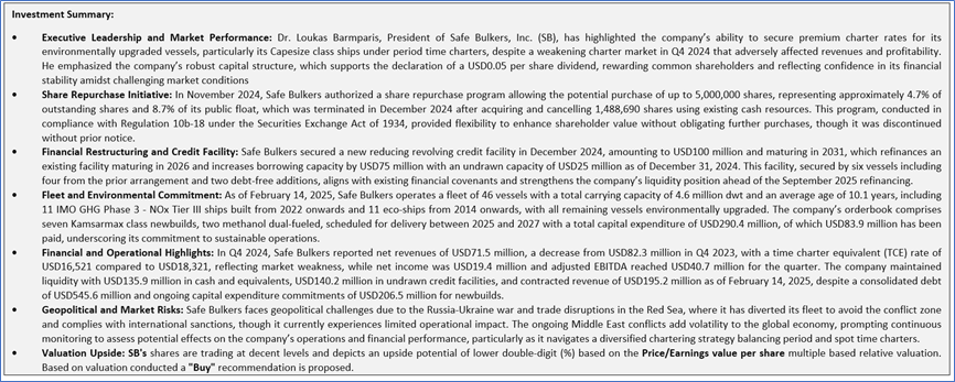 Safe Bulkers, Inc. (NYSE: SB) is a holding company. The Company's principal business is the acquisition, ownership and operation of drybulk vessels. The Company's vessels operate across the world, carrying drybulk cargo for the consumers of marine drybulk transportation services. The Company is an international provider of marine drybulk transportation services, transporting bulk cargoes, particularly coal, grain and iron ore, along shipping routes across the world.