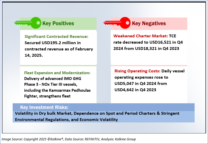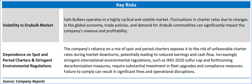 Safe Bulkers, Inc. (SB) exhibited a commendable enhancement in its financial profitability metrics from fiscal year 2023 to fiscal year 2024, with the gross profit margin improving from 59.47% to 62.36%, reflecting greater efficiency in revenue generation relative to cost of services, likely attributable to optimized operations and premium charter rates for its upgraded fleet. The EBITDA margin rose from 52% to 55.26%, and the operating margin increased from 32.97% to 36.37%, indicating improved operational leverage and cost management, bolstered by strategic fleet utilization and a shift toward higher-margin period time charters. Furthermore, the net margin advanced from 27.20% to 31.65%, underscoring enhanced profitability after accounting for all expenses, driven by a favorable market position and disciplined financial oversight. The return on average common equity improved from 8.87% to 11.01%, and the return on average total assets rose from 5.98% to 7.10%, signaling a more effective deployment of equity and asset bases to generate earnings, reinforcing the company’s strengthened financial health and operational resilience in 2024.