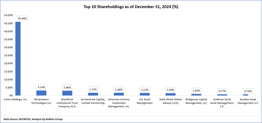 The top 10 shareholders together form ~61.06% of the total shareholding, signifying concentrated shareholding. Vorini Holdings, Inc. and Renaissance Technologies LLC, are the biggest shareholders, holding the maximum stake in the company at ~45.96% and ~3.14%, respectively.