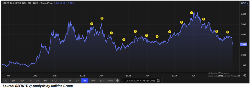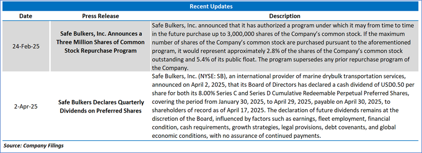 Safe Bulkers, Inc. (SB) has implemented a structured dividend policy, as demonstrated by the Board of Directors’ declaration on February 18, 2025, of a USD0.05 per share cash dividend on its common stock, payable on March 21, 2025, to shareholders of record as of March 3, 2025, based on 105,299,771 outstanding shares as of February 14, 2025, following a similar USD0.05 per share dividend paid on December 17, 2024, to shareholders of record on December 2, 2024. Additionally, the company has consistently supported its Series C and Series D Cumulative Redeemable Perpetual Preferred Shares (NYSE: SB.PR.C and SB.PR.D) with quarterly dividends of USD0.50 per share, with payments executed on January 30, 2025, for the period from October 30, 2024, to January 29, 2025, to shareholders of record as of January 17, 2025, and on October 30, 2024, for the period from July 30, 2024, to October 29, 2024, to shareholders of record as of October 18, 2024, reflecting a current yield of 6.56%. The dividend policy remains discretionary, with future declarations contingent upon the Board’s assessment of factors including the company’s earnings, fleet employment status, financial health, liquidity needs, strategic growth and fleet renewal plans, compliance with Marshall Islands and Liberian legal frameworks, restrictive covenants in debt agreements, and prevailing global economic conditions, with no assurance of continued distributions.