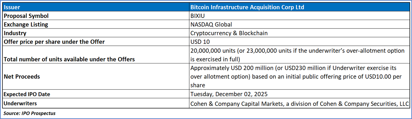 Bitcoin Infrastructure Acquisition Corp Ltd (BIXIU) is a Cayman Islands–incorporated blank-check company, formed in June 2025 and renamed in August 2025, with no operational activities of its own and established for the purpose of pursuing a merger or similar business combination. While sector-agnostic in principle, the Company intends to focus on digital-asset-aligned industries, including blockchain infrastructure, Web3 technologies, financial services infrastructure, decentralized finance, custody and wallet solutions, exchanges, tokenized financial instruments, and blockchain-enabled payment and cross-border systems—leveraging the management team’s deep investment experience across crypto and technology ecosystems. The Sponsor, Samara Acquisition Sponsor V Ltd., wholly controlled by Vikas Mittal, is affiliated with Meteora, an investment adviser with extensive SPAC expertise and broad sector reach, providing strategic support, networks, SPAC lifecycle experience, and access to a substantial pipeline of private companies.