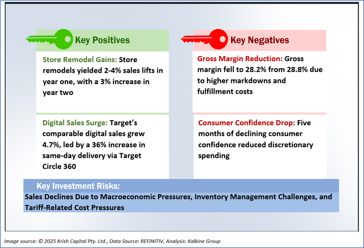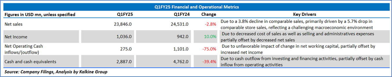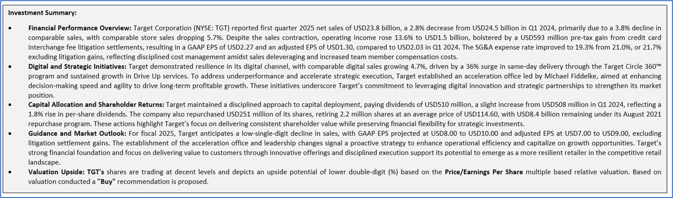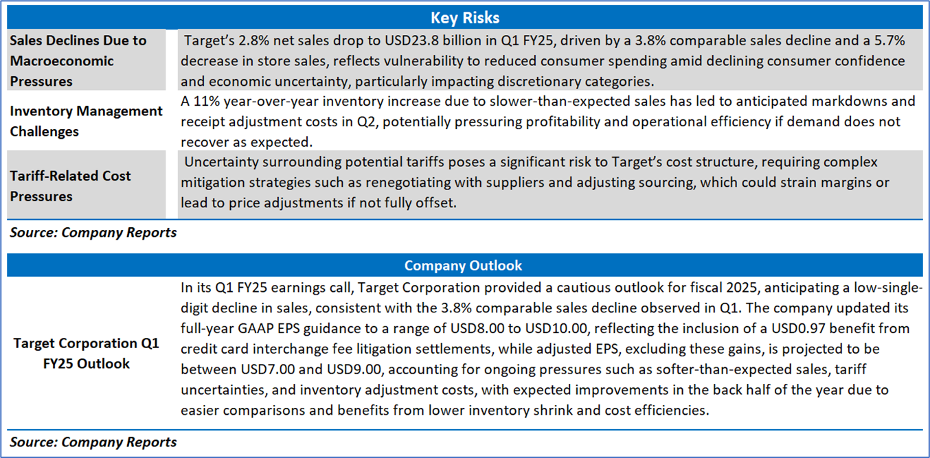 Target Corporation’s Q1 FY25 financial performance reflects a mixed but resilient outlook amidst a challenging retail environment, with key metrics indicating operational improvements despite macroeconomic pressures. The gross profit margin slightly declined to 25.4% from 26.4% in Q1 FY24, driven by higher markdowns and digital fulfillment costs, though partially offset by lower inventory shrink. However, significant gains in profitability metrics highlight operational efficiency, with the EBITDA margin rising to 12.0% from 8.2% and the operating margin improving to 8.7% from 5.3%, largely due to a USD593 million litigation settlement gain and disciplined cost management. The net margin increased to 4.3% from 3.8%, supported by a 5.8% income before tax margin (up from 5.0%), despite a higher income tax rate of 25.0% compared to 22.7%. Free cash flow yield improved to 7.9% from 6.3% on a trailing twelve-month (TTM) basis, underscoring strong cash generation, while TTM returns on average common equity (29.1% vs. 32.5%), total assets (7.5% vs. 7.7%), and invested capital (14.9% vs. 15.7%) saw slight declines, reflecting sales pressures and an 11% inventory increase.