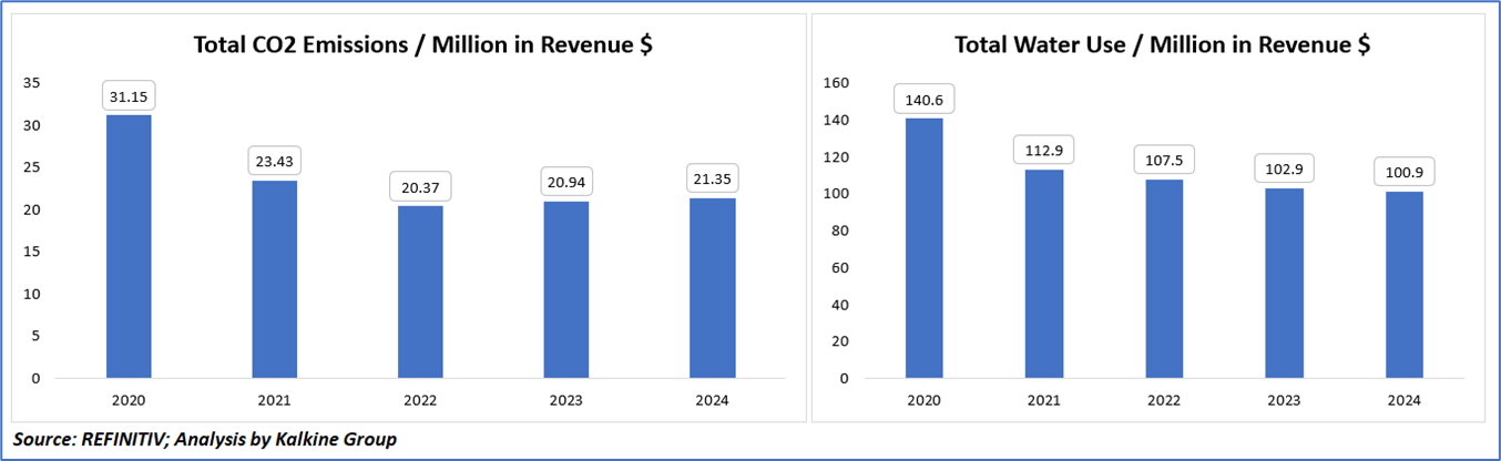CO₂ emissions dropped significantly from 31.15 in 2020 to 20.37 in 2022, with a slight uptick to 21.35 by 2024. Similarly, water usage decreased steadily from 140.6 to 100.9 over the same period. These figures indicate notable improvements in environmental efficiency, although the minor rise in CO₂ emissions after 2022 suggests the need for renewed focus on carbon reduction initiatives to maintain progress.