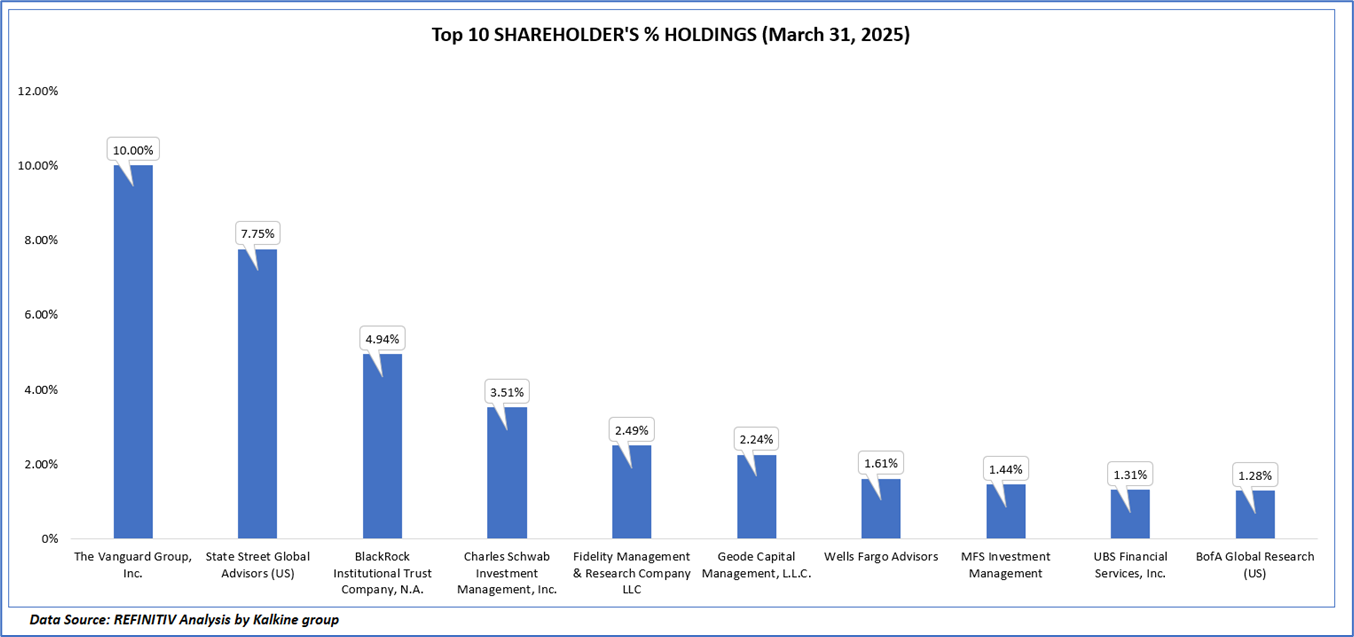 The top 10 shareholders together form ~36.58% of the total shareholding, signifying concentrated shareholding. The Vanguard Group, Inc. and State Street Global Advisors (US) are the biggest shareholders, holding the maximum stake in the company at 10.00% and 7.75%, respectively.
