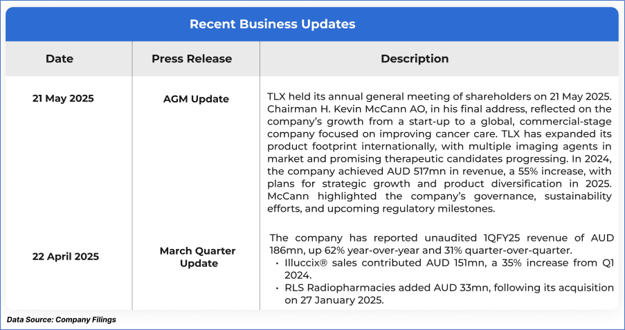 The stock price has gone up by ~0.68% in the last one month and over the last six months, stock prices went up by ~14.19%. The stock has a 52-week low and 52-week high of AUD 15.150 and AUD 31.970, respectively, and is currently trading above the mid-range of the 52-week-high-low levels. TLX was last covered in a report dated ‘5 March 2025’.