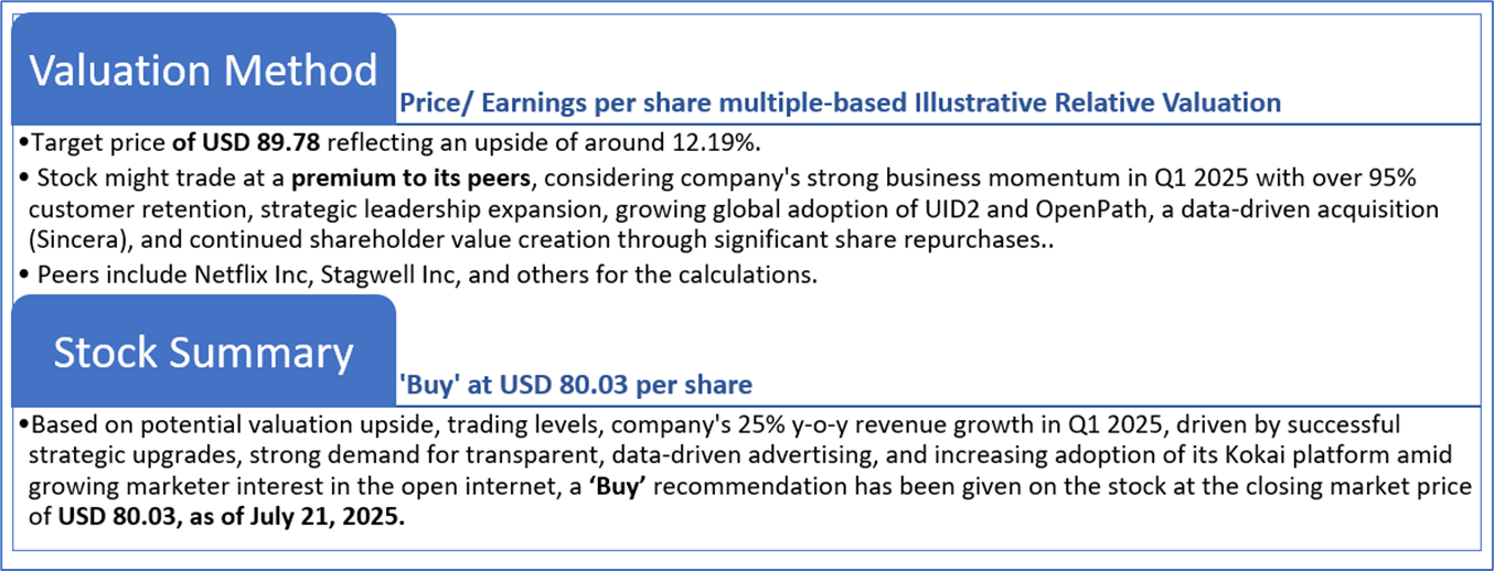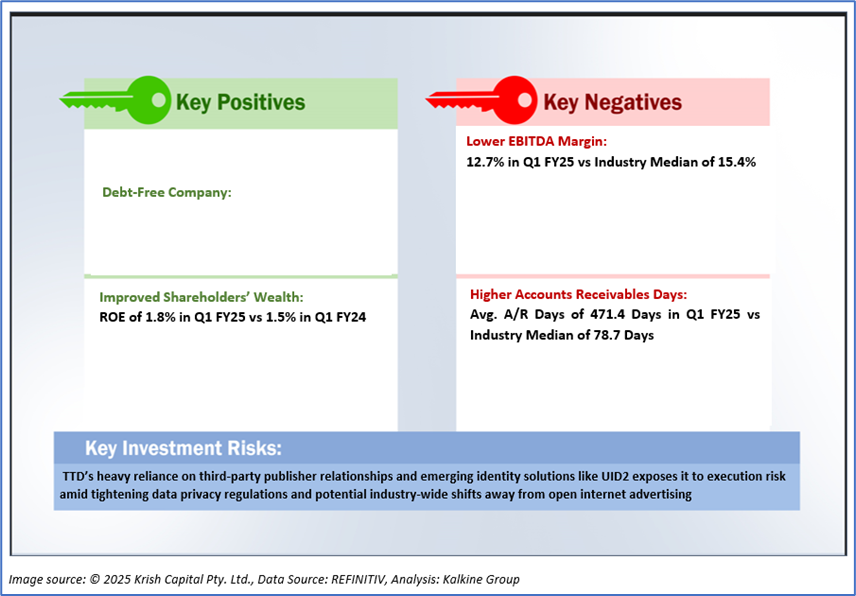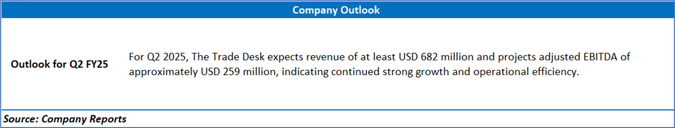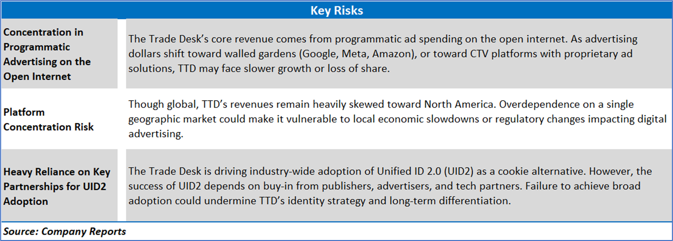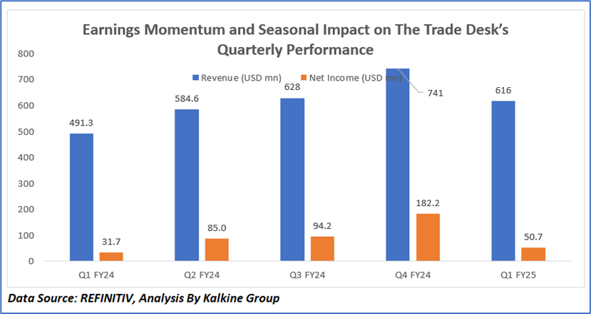 The Trade Desk’s revenue shows a consistent upward trend from USD 491.3 million in Q1 FY24 to a peak of USD 741 million in Q4 FY24, followed by a modest dip to USD 616 million in Q1 FY25. Net income follows a similar growth pattern, rising significantly from USD 31.7 million in Q1 FY24 to USD 182.2 million in Q4 FY24, before declining to USD 50.7 million in Q1 FY25. This Q1 FY25 pullback in both revenue and net income reflects seasonality, wherein Q4 typically benefits from higher ad spending during the holiday season, while Q1 usually sees softer demand. Additionally, as per the financial disclosures, increased operating expenses in platform operations, technology, and marketing (driven partly by higher stock-based compensation) compressed margins. While the company maintained strong year-over-year growth in Q1 FY25 (+25% in revenue), the quarter-over-quarter decline was expected and driven by post-holiday normalization and elevated costs tied to strategic investments and workforce compensation.
