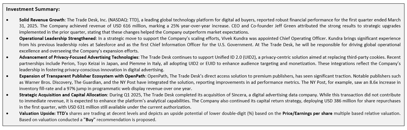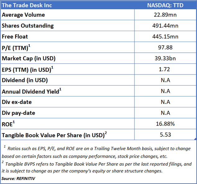 The Trade Desk Inc (NASDAQ: TTD) is a worldwide advertising technology firm that provides a cloud-based, self-service platform. This platform enables clients to design, execute, optimize, and evaluate highly data-driven digital advertising campaigns with greater precision and flexibility.