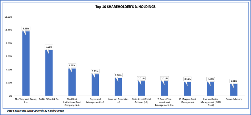 The top 10 shareholders together form ~ 37.43% of the total shareholding, signifying dispersed shareholding. The Vanguard Group, Inc. and Baillie Gifford & Co. are the biggest shareholders, holding the maximum stake in the company at 9.83% and 7.01%, respectively.