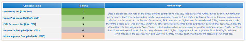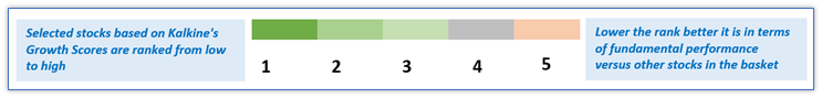 Note: Selected growth stocks are ranked from low to high using Kalkine’s unique ranking methodology, where-in low rank implies better fundamental metrics performance versus other stocks in the basket. Refer to Section 5 for more details on metrics used in ranking the growth stocks from low to high.