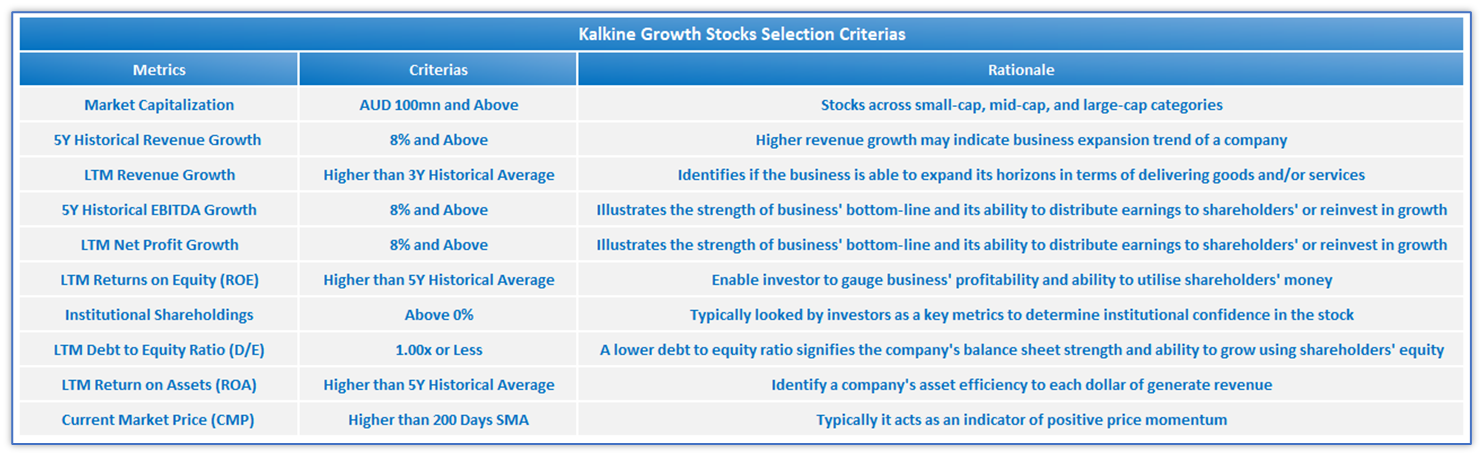 ASX-listed growth stocks are scored based on the below set of quantitative fundamental criteria’s as per Kalkine’s unique scoring methodology. The objective is to screen the growth companies with a track record of revenue and EBITDA growth for 5 or more years. Only stocks that scored highest and met the selection criterias based on all of the above quantitative fundamental metrics were further scored. The scoring was done among all the screened stocks based on their fundamental performance relative to the stock basket selected.
