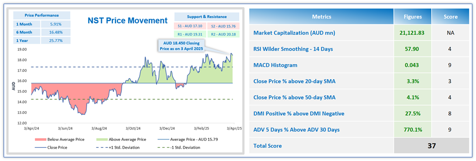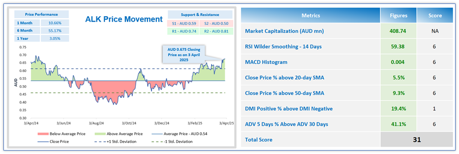 ASX-listed Momentum Stocks are scored based on the below set of quantitative technical criteria’s as per Kalkine’s unique scoring methodology. The objective is to screen the companies with an upward price momentum with volume greater than 500 thousand. Only stocks that scored highest and met the selection criterias based on all of the above quantitative technical metrics were further scored. The scoring was done among all the screened stocks based on their technical performance relative to the stock basket selected.