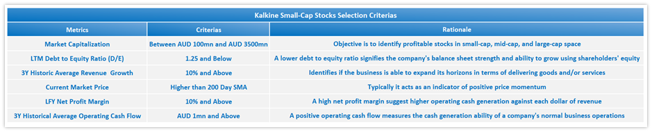 ASX-listed Small-Cap Stocks are scored based on the below set of quantitative fundamental criteria’s as per Kalkine’s unique scoring methodology. The objective is to screen the companies with favourable fundamentals and a track record of revenue growth and operating cash flow for 3 years. Only stocks that scored highest and met the selection criterias based on all of the above quantitative fundamental metrics were further scored. The scoring was done among all the screened stocks based on their fundamental performance relative to the stock basket selected.