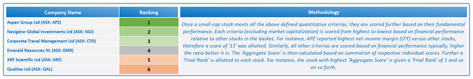 Note: Selected Small-Cap Stocks are ranked from low to high using Kalkine’s unique ranking methodology, where-in low rank implies better fundamental metrics performance versus other stocks in the basket. Refer to Section 5 for more details on metrics used in ranking the Small-Cap Stocks from low to high.