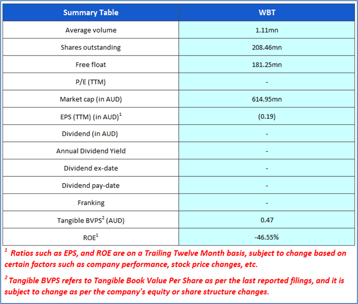 The stock has increased by ~20.35% in last one month, and over the last three months, it has moved up by ~60.0%. The stock has a 52-week low and 52-week high of AUD 1.380 and AUD 3.800, respectively and is currently trading above the 52-week high-low average. WBT was last covered in a report dated ’07 July 2025’.