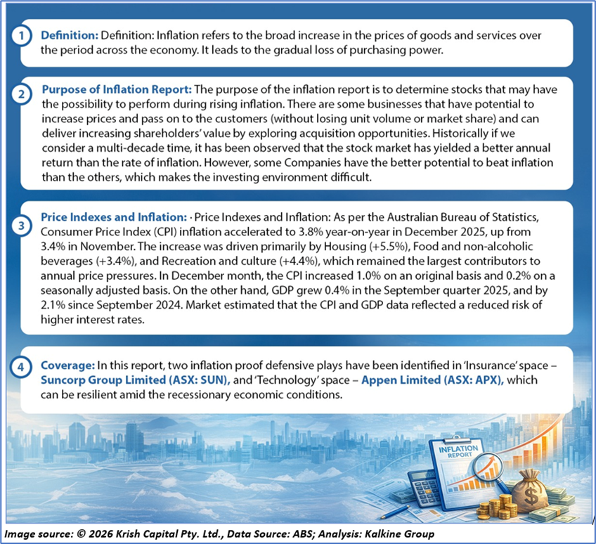 Company Overview: Suncorp Group Limited (ASX: SUN) is a Trans-Tasman insurer providing general insurance products and services to retail, commercial, and corporate customers across Australia and New Zealand. Headquartered in Brisbane with a history spanning over a century, Suncorp operates through some of the region’s most trusted insurance brands. Appen Limited (ASX: APX) specialises in providing data for the AI lifecycle, backed by over 28 years of expertise in data sourcing, annotation, and evaluation. With a diverse crowd of over 1 million skilled contractors fluent in more than 500 languages, the company enables organisations to develop innovative AI systems. Kalkine’s Inflation Report covers the Investment Highlights, Key Financial Metrics, Risks, Outlook, Technical Analysis along with the Valuation, Target Price, and Recommendation on these two stocks.