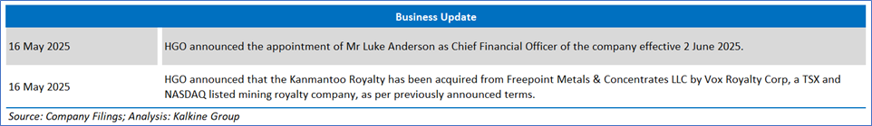 The stock has declined by ~19.15% in the last three months and over the last six months, it has corrected by ~29.63%. The stock has a 52-week low and 52-week high of AUD 0.029 and AUD 0.089, respectively, and is currently trading below the average of 52-week high-low average. HGO was last covered in a report dated ‘24 January 2025’.