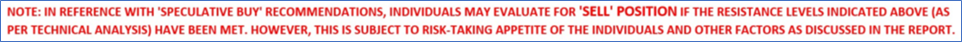 Note 3: Investment decisions should be made depending on an individual’s appetite for upside potential, risks, holding duration, and any previous holdings. An ‘Exit’ from the stock can be considered if the Target Price mentioned as per the Valuation and or the technical levels provided has been achieved and is subject to the factors discussed above.