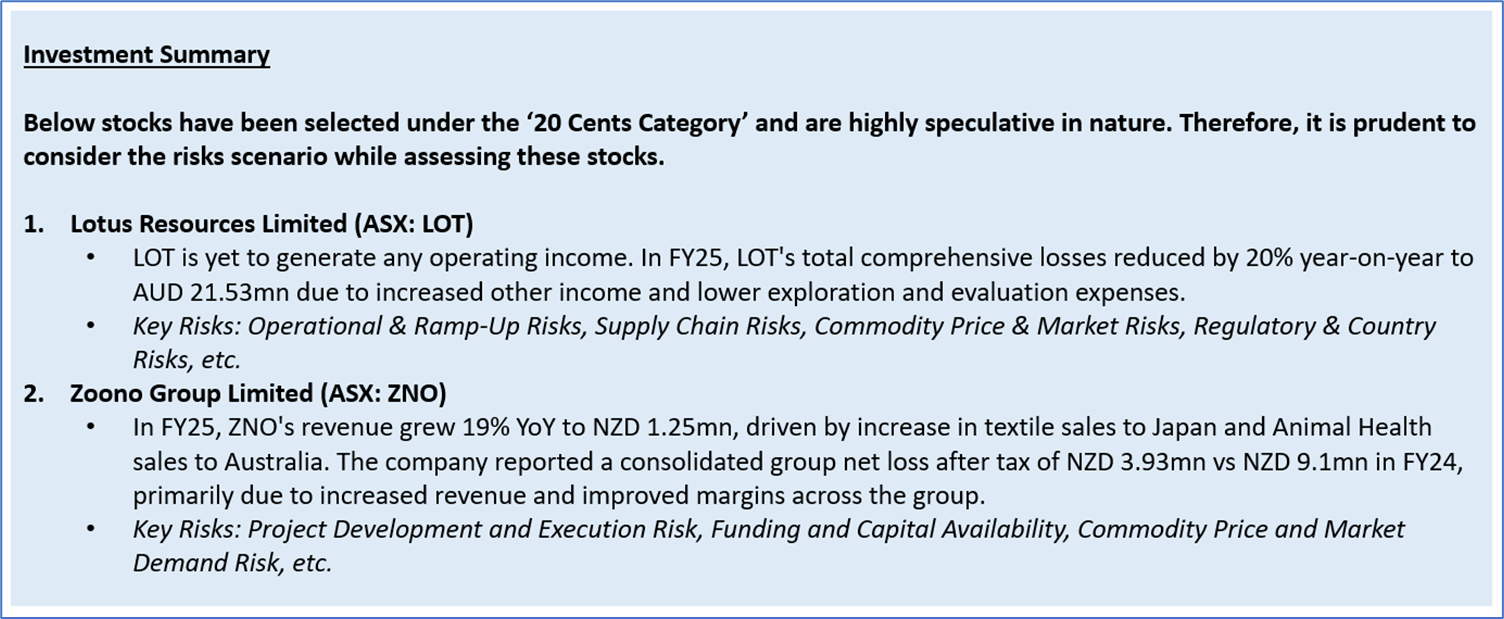 Company Overview: Lotus Resources Limited (ASX: LOT) is an advanced uranium company. The principal activities of the Company include the exploration and development of its Kayelekera Uranium Project in Malawi and Letlhakane Uranium Project in Botswana. The Company operates through four business segments and two geographical locations. Zoono Group Limited (ASX: ZNO) is an Australia-based global biotech company that develops, manufactures and distributes a suite of antimicrobial solutions in multiple countries. The Company produces sprays, wipes and foams suited for skin care, surface sanitizers and mold remediation treatments. Kalkine’s ‘Stocks Under 20 cents’ report covers the Investment Summary, Key Financial Metrics, Risks, Outlook, SWOT Analysis, Technical Analysis along with the TTM-Valuation and Recommendation on the stocks.