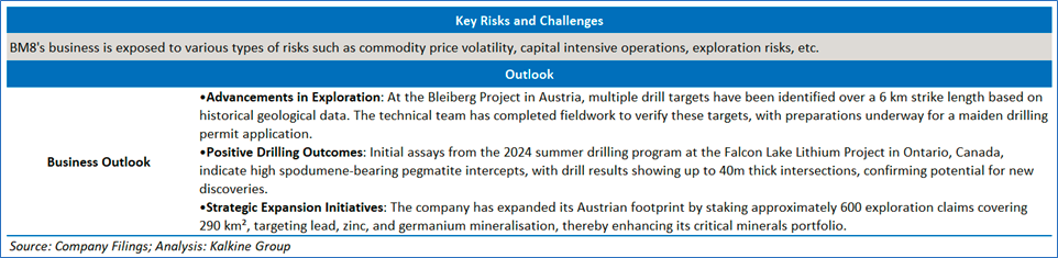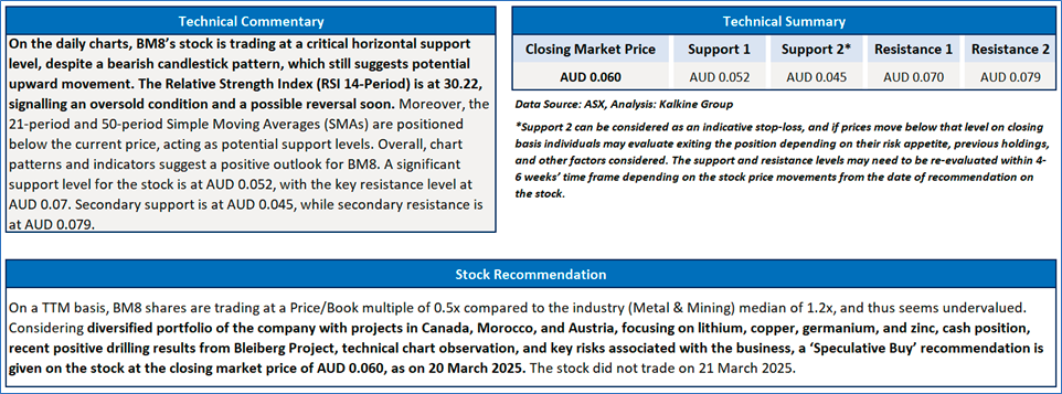 The stock has witnessed a correction of ~39.99% in the last three months and over the last six months, it has declined by ~47.83%. The stock has a 52-week low and 52-week high of AUD 0.060 and AUD 0.190, respectively, and is currently trading nearly at 52-week low level. BM8 was last covered in a report dated ‘6 February 2025’.