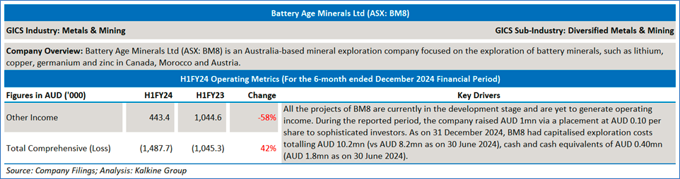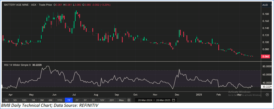2. Battery Age Minerals Ltd (ASX: BM8) (Recommendation: Speculative Buy, Market Cap: AUD 7.14mn)