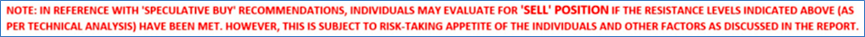 Note 3: Investment decisions should be made depending on an individual’s appetite for upside potential, risks, holding duration, and any previous holdings. An ‘Exit’ from the stock can be considered if the Target Price mentioned as per the Valuation and or the technical levels provided has been achieved and is subject to the factors discussed above.