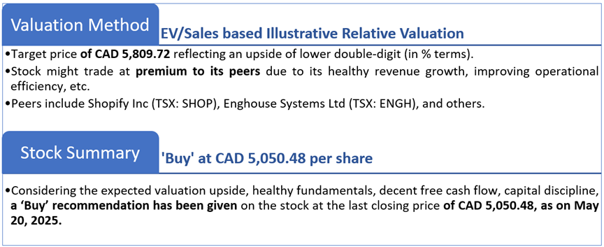 The stock has witnessed an upside of ~2.30% and ~2.03% over the last 1 week and 3 months respectively. Moreover, the stock is trading above the average 52-week high price of CAD 5,300.00 and 52-week low price of CAD 3,660.53, providing an opportunity to ride the trend.