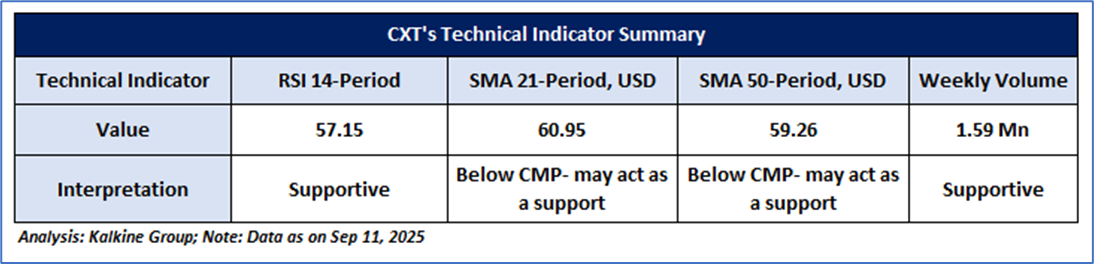CXT's stock price has held firm at crucial support levels and has gradually risen, indicating potential for further gains in the near term. The next significant resistance is at USD 70.59, which the stock is likely to approach within the next 2-4 weeks, possibly prompting a reaction. A successful breakout above USD 70.59 could attract increased buying interest and possibly drive a continued upward movement