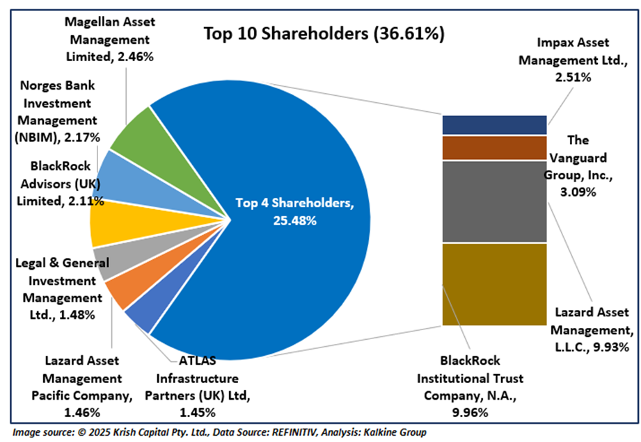 1.3: Top 10 Shareholders: The top 10 shareholders together form ~36.61% of the total shareholding. BlackRock Institutional Trust Company, N.A. and Lazard Asset Management, L.L.C. are holding maximum stakes in the company at ~9.96% and ~9.93%, respectively.
