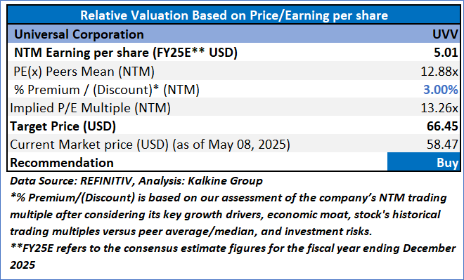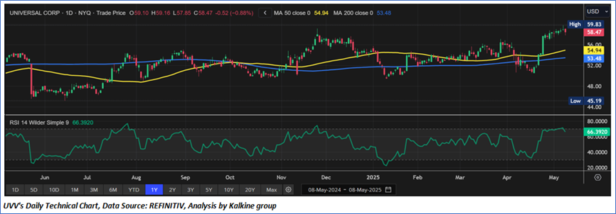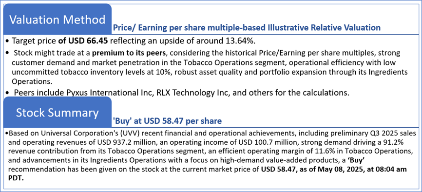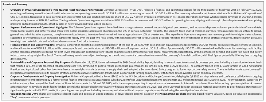 Universal Corporation (NYSE: UVV) is a global business-to-business agriproducts company. The Company is a global leaf tobacco supplier and provides plant-based ingredients to food and beverage end markets. The Company operates through two segments: Tobacco Operations and Ingredients Operations. The Tobacco Operations segment activities involve contracting, procuring, processing, packing, storing, and shipping leaf tobacco for sale to, or for the account of, manufacturers of consumer tobacco products throughout the world.