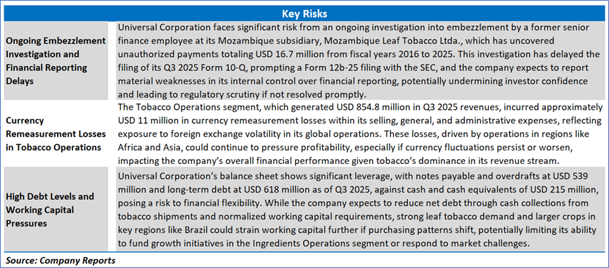 Universal Corporation (NYSE: UVV) exhibited a marginal improvement in several key financial metrics in Q3 FY 2025 compared to Q3 FY 2024, reflecting operational resilience amidst market challenges. The gross profit margin increased slightly to 20.66% from 20.32%, indicating modest gains in cost management or pricing strategies within its Tobacco and Ingredients Operations segments. Similarly, the EBITDA margin rose to 12.72% from 12.57%, and the operating margin improved to 11.11% from 10.76%, driven by robust tobacco sales volumes and enhanced operational efficiencies, despite currency remeasurement losses of USD 11 million in the Tobacco Operations segment. The income before tax margin edged up to 9.39% from 9.22%, but a higher income tax rate of 22.97% compared to 19.11% in the prior year led to a slight decline in the net margin to 7.23% from 7.46%, reflecting increased tax pressures that offset operational gains. Additionally, the trailing twelve-month free cash flow yield improved significantly to 4.88% from 3.78%, signaling stronger cash generation capabilities, supported by efficient working capital management and tobacco shipment cash collections, which bolsters the company’s financial flexibility despite ongoing challenges such as the embezzlement investigation and high leverage.