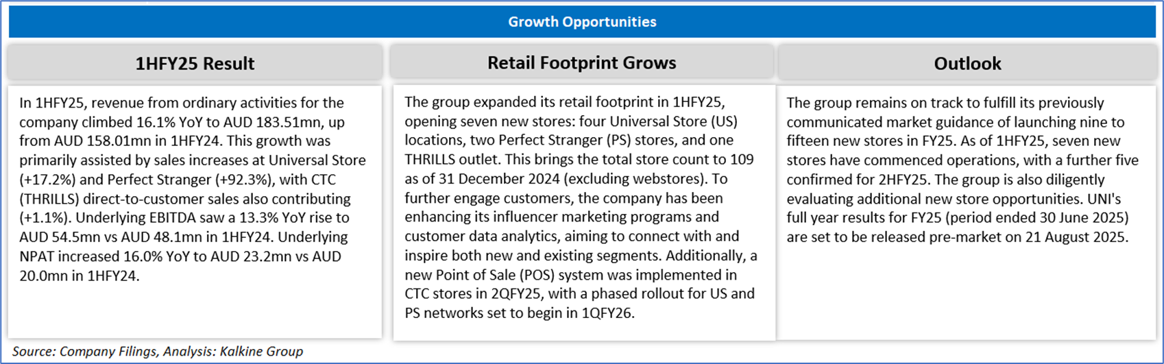 Company Overview: Universal Store Holdings Limited (ASX: UNI) is an Australian retailer specializing in trend-led and casual fashion for men and women, including clothing, shoes, accessories, lifestyle products, and gifting items. Kalkine’s Earnings Hunter Report covers the Key Financial Metrics, Risks, Outlook, Technical Analysis along with the earnings hunter score and rating on the stock.
