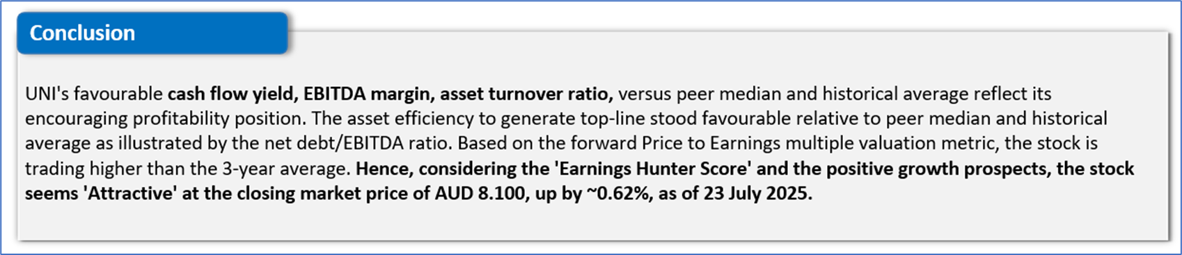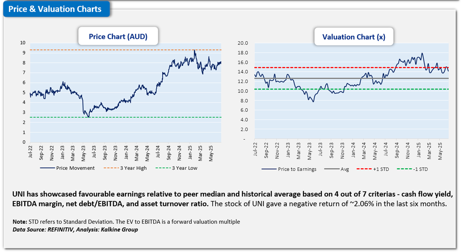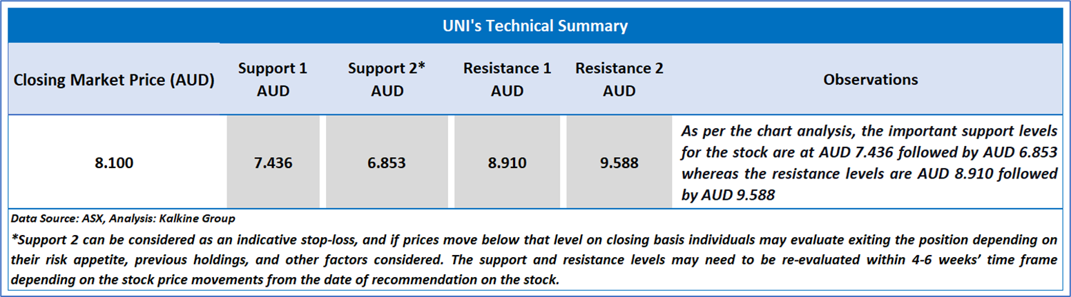 The stock has gone down by ~2.06% in the last six months, and over the last nine months, it has decreased by ~1.34%. The stock has a 52-week low and 52-week high of AUD 5.650 and AUD 9.610, respectively, and is currently trading above the 52-week high-low average. UNI was last covered in a report dated ’07 July 2025’.