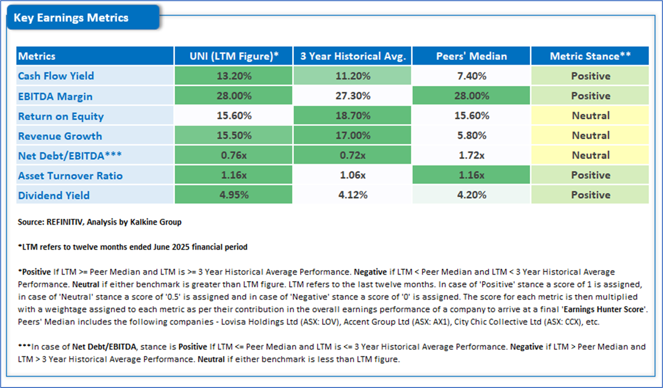 Company Overview: Universal Store Holdings Limited (ASX: UNI) is a retailer specialising in trend-led and casual men’s and women’s fashion, shoes, accessories, lifestyle, and gifting. The company owns a portfolio of premium youth fashion brands and omnichannel retail and wholesale businesses. Kalkine’s Earnings Hunter Report covers the Key Financial Metrics, Risks, Outlook, Technical Analysis along with the earnings hunter score and rating on the stock.