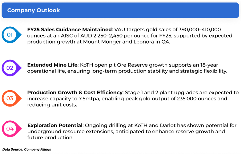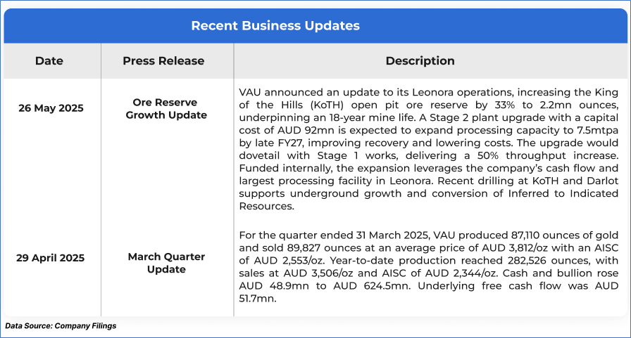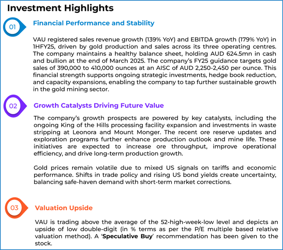 1.1: Company Overview: Vault Minerals Limited (ASX:VAU) is engaged in the exploration, mine development, operations, and sale of gold and gold/copper concentrate in Australia and Canada. The company is underpinned by a long-life asset in the prolific Leonora district, supported by established infrastructure. VAU maintains a disciplined growth strategy focused on low-capex expansion and mine life extensions. Kalkine’s Gold Report covers the Investment Highlights, Management Insights, Key Financial Metrics, Risks, Technical Analysis along with the Valuation, Target Price, and Recommendation on the stock.