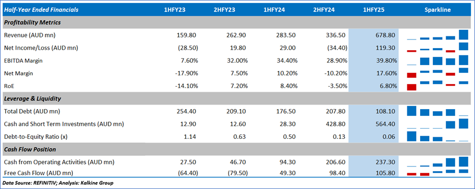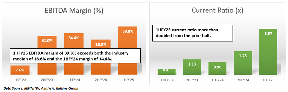 1.4: Key Metrics: VAU registered cash cycle days of 12.1 days in 1HFY25 compared with the industry median of 36.0 days. Below is captured the metrics showing the trend of EBITDA margin and current ratio since 1HFY23: