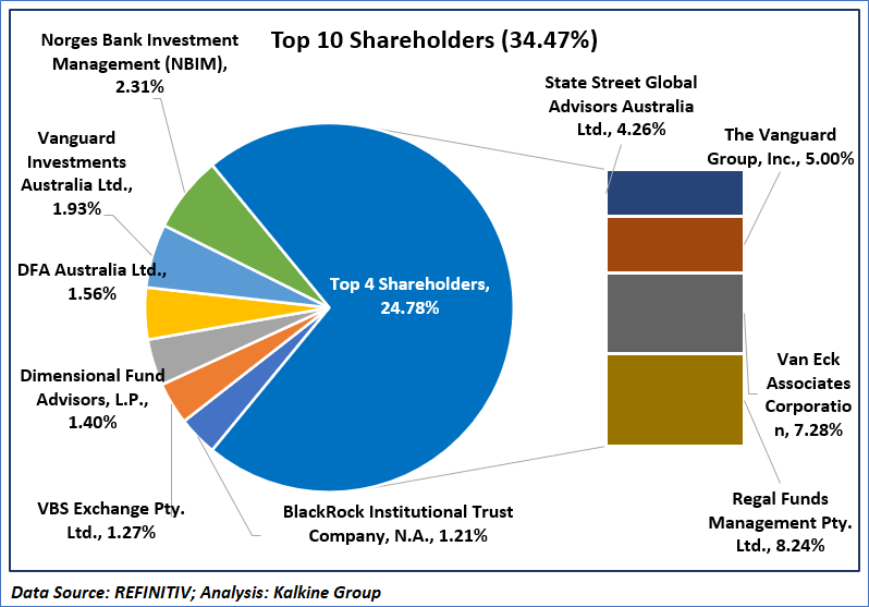 1.3: Top 10 Shareholders: The top 10 shareholders together form ~34.47% of the total shareholding. Regal Funds Management Pty. Ltd. and Van Eck Associates Corporation are holding maximum stakes in the company at ~8.24% and ~7.28%, respectively.