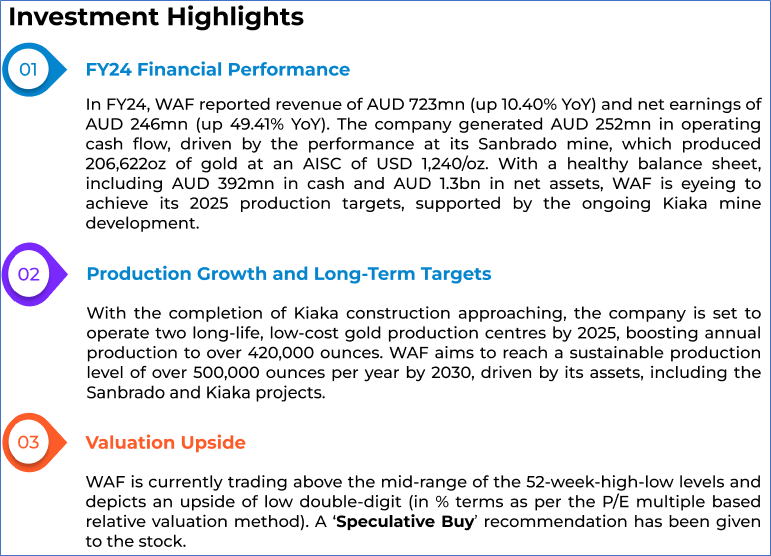 1.1: Company Overview: West African Resources Limited (ASX: WAF) is an unhedged gold mining company focused on the operation of the Sanbrado Gold Project and the development of the Kiaka and Toega gold projects in Burkina Faso. WAF aims to become a sustainable +500koz producer by 2030. Kalkine’s Investor Report covers the Investment Highlights, Management Insights, Key Financial Metrics, Risks, Technical Analysis along with the Valuation, Target Price, and Recommendation on the stock.