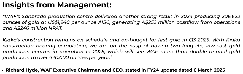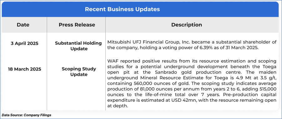 The stock price has gone down by ~9.05% in the last one month and over the last six months, stock prices went up by ~50.00%. The stock has a 52-week low and 52-week high of AUD 1.180 and AUD 2.430, respectively, and is currently trading above the mid-range of the 52-week-high-low levels. WAF was last covered in a report dated ‘10 February 2025’.