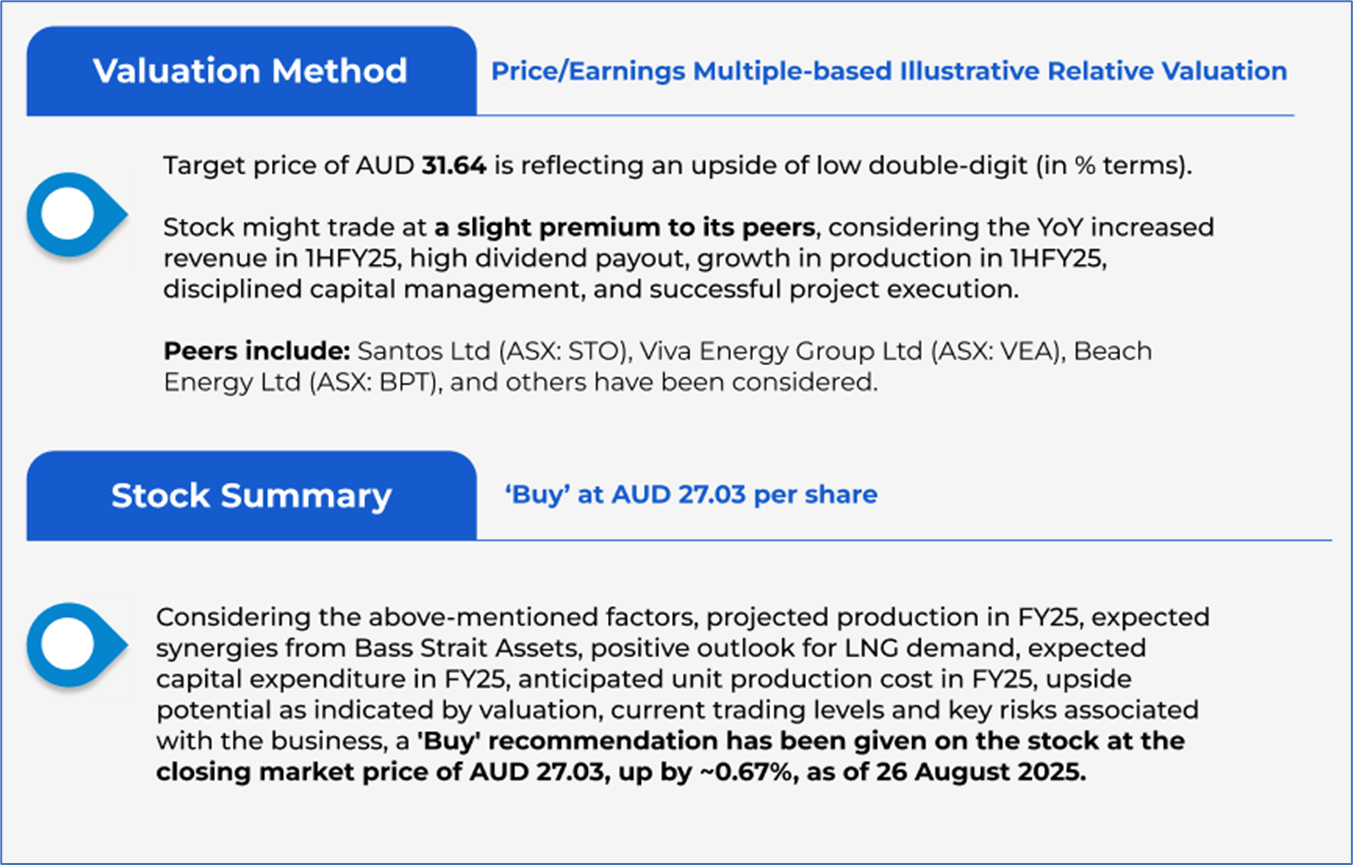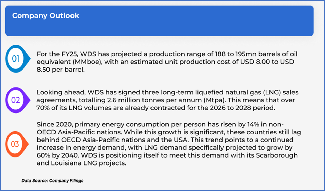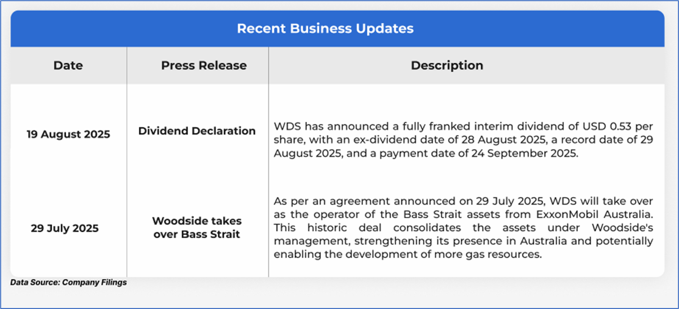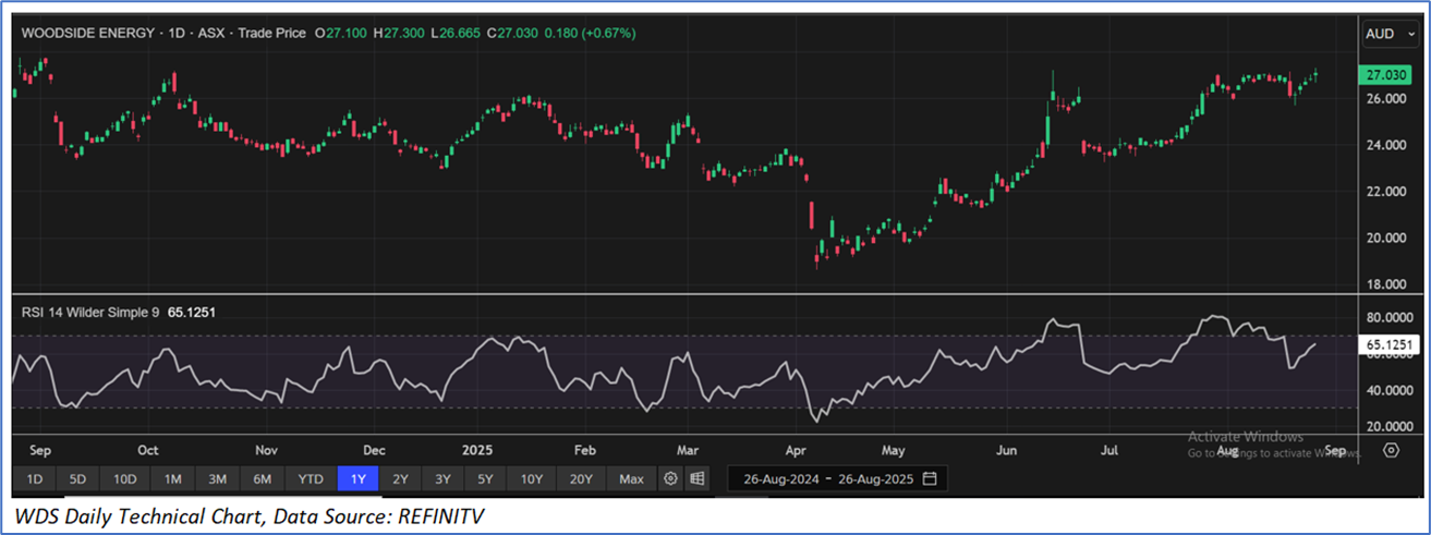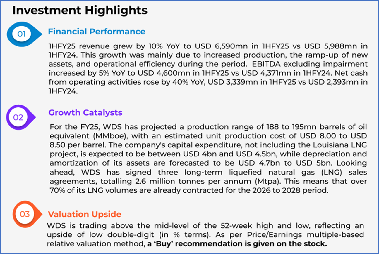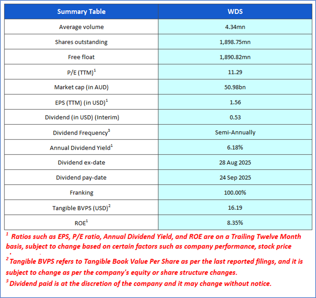 The stock has gone up by ~10.78% in the last nine months, whereas over the last one year, the stock has decreased by ~2.46%. The stock has a 52-week low and 52-week high of AUD 18.610 and AUD 27.770, respectively, and is currently trading above the average of 52-week high and low. WDS was last covered in a report dated ‘13 June 2025’.