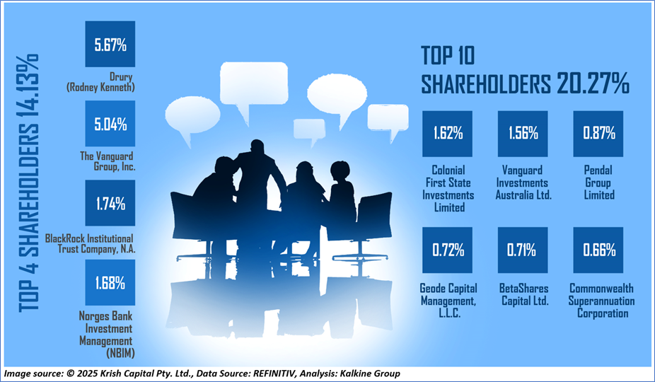 1.3: Top 10 Shareholders: The top 10 shareholders together form ~20.27% of the total shareholding. Drury (Rodney Kenneth) and The Vanguard Group, Inc. are holding maximum stakes in the company at ~5.67% and ~5.04%, respectively.