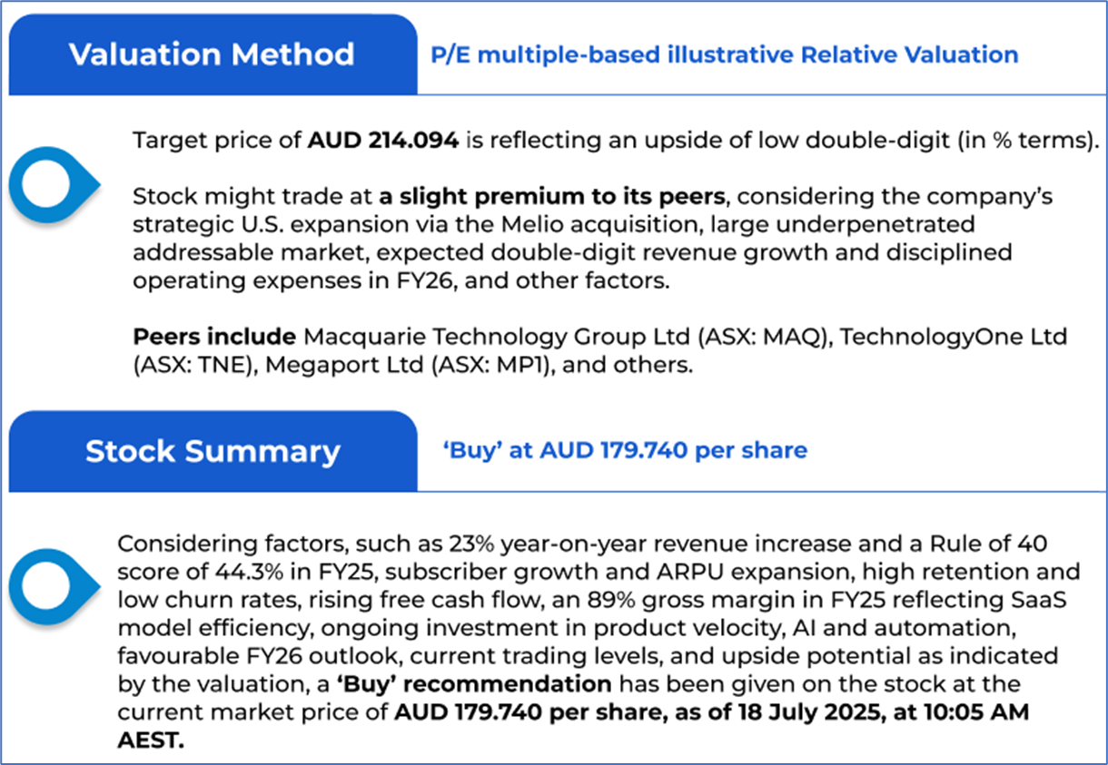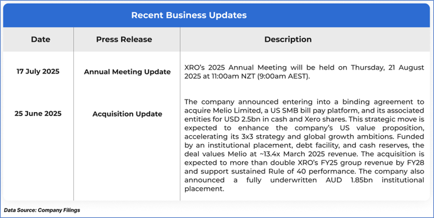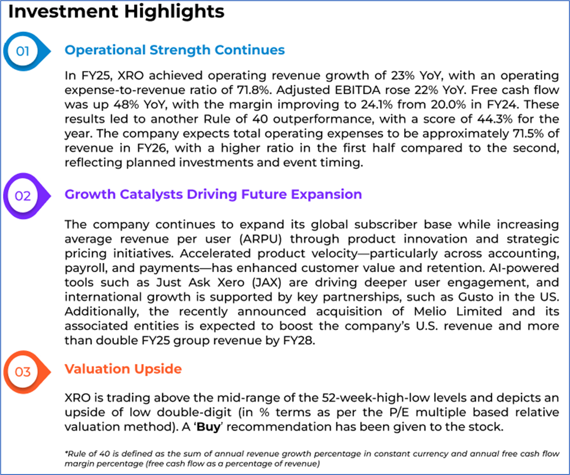 The stock price has gone down by ~7.14% in the last one month and over the last six months, stock prices gained ~6.56%. The stock has a 52-week low and 52-week high of AUD 126.690 and AUD 196.520, respectively, and is currently trading above the mid-range of the 52-week-high-low levels. XRO was last covered in a report dated ‘28 May 2025’.