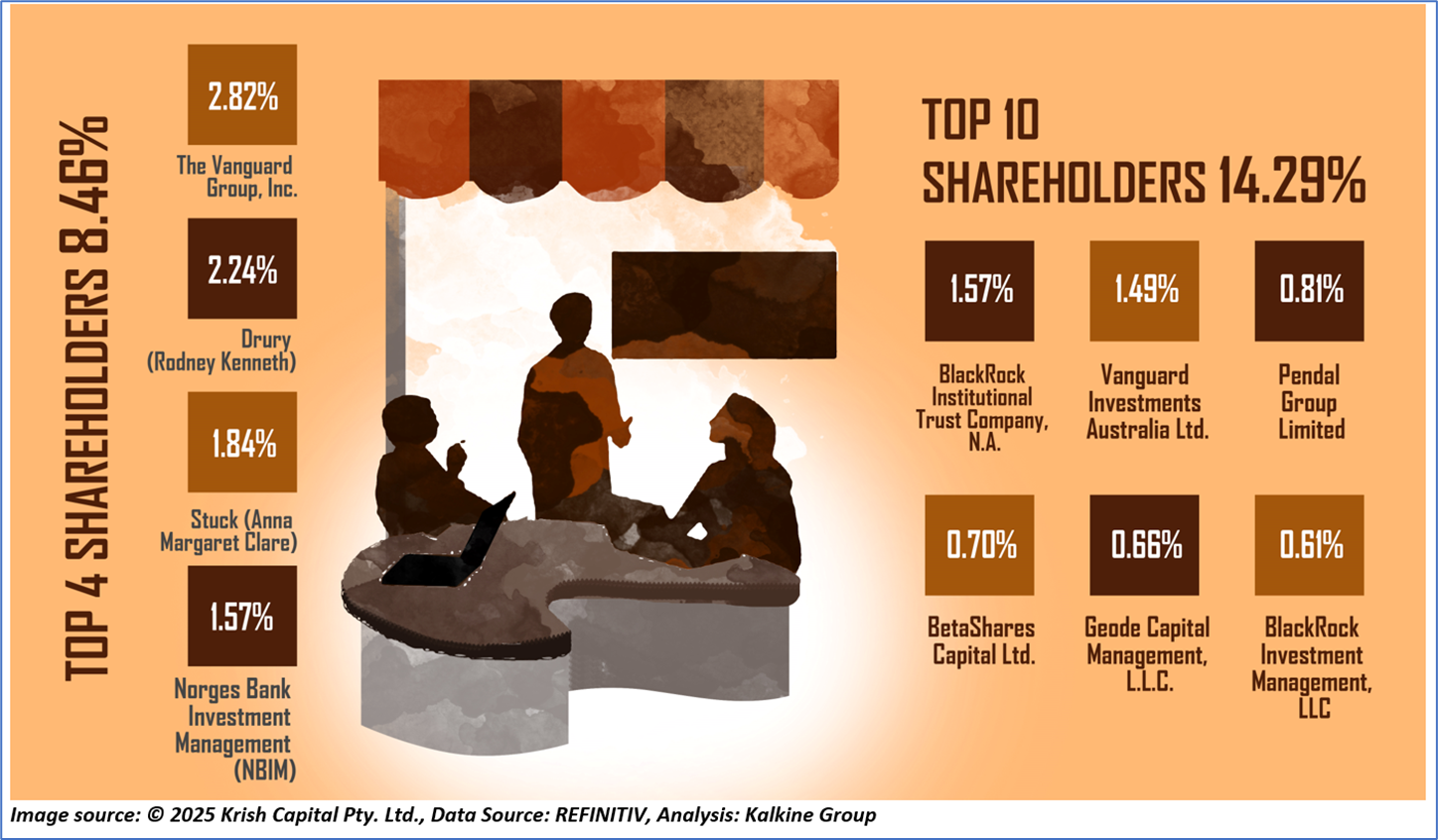 1.3: Top 10 Shareholders: The top 10 shareholders together form ~14.29% of the total shareholding. The Vanguard Group, Inc. and Drury (Rodney Kenneth) are holding maximum stakes in the company at ~2.82% and ~2.24%, respectively.