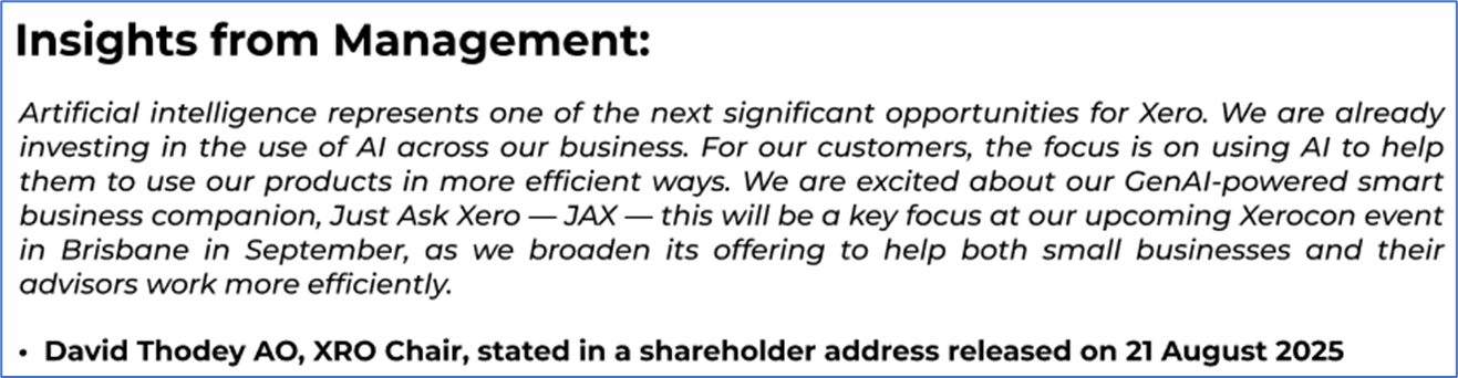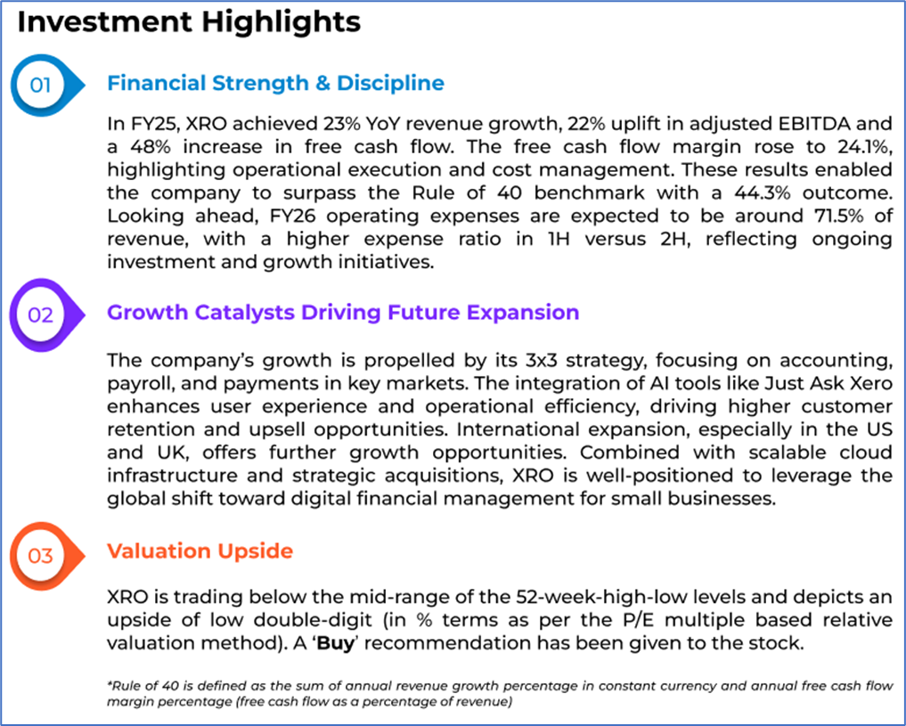 The stock price has gone down by ~9.70% in the last one month and over the last six months, stock prices declined by ~4.95%. The stock has a 52-week low and 52-week high of AUD 134.000 and AUD 196.520, respectively, and is currently trading below the mid-range of the 52-week-high-low levels. XRO was last covered in a report dated ’18 July 2025’.