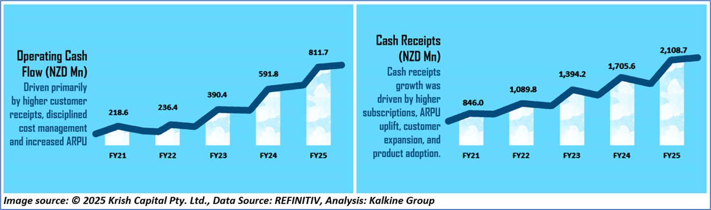 1.4: Key Metrics: XRO registered a fixed asset turnover ratio of 16.91x in FY25 compared with the industry median of 8.59x. Below is captured the metrics showing the trend of operating cash flow and cash receipts since FY21: