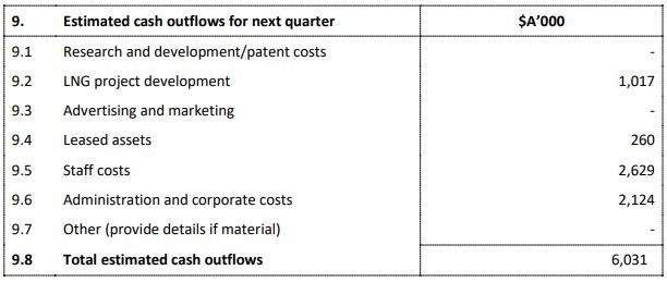 Cash flow Highlights: During the quarter ended 30 September 2019, net cash used in operations stood at $6.8 million, as compared to $6.7 million in the previous quarter. The company exited the quarter with cash & cash equivalent of $14.9 million, as compared to $22.1 million at the end of the previous quarter. The company expects total cash outflows in the coming quarter to be approximately $6.03 million, after making major payments for staff costs & administration and corporate costs of $2.63 million and ~$2.12 million, respectively. LNG project developmentcosts for the quarter are expected to be ~$1.02 million.